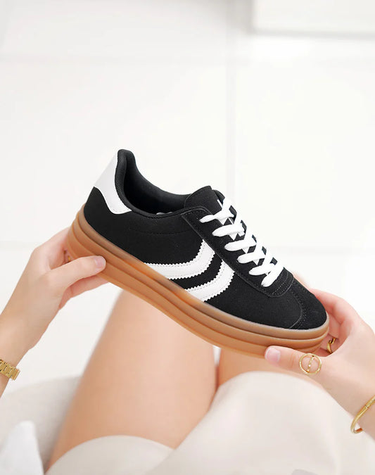 Basket femme noire à bandes blanches et semelle marron tendance