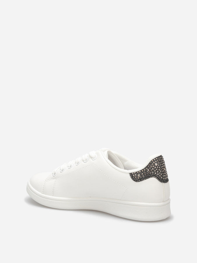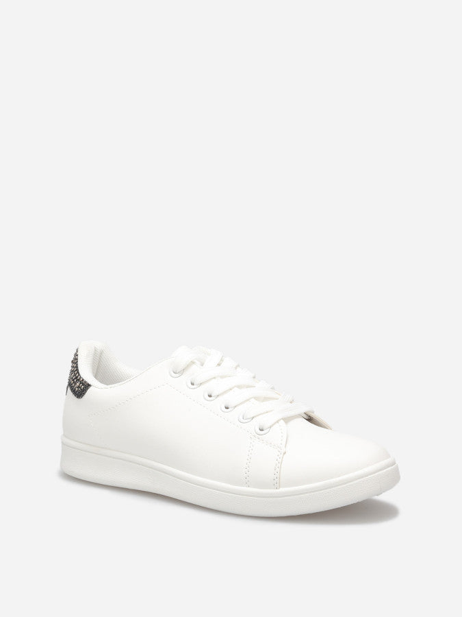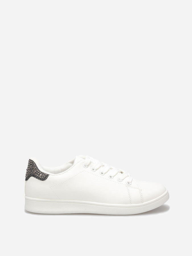 Baskets basses en simili avec détail en strass à l'arrière.