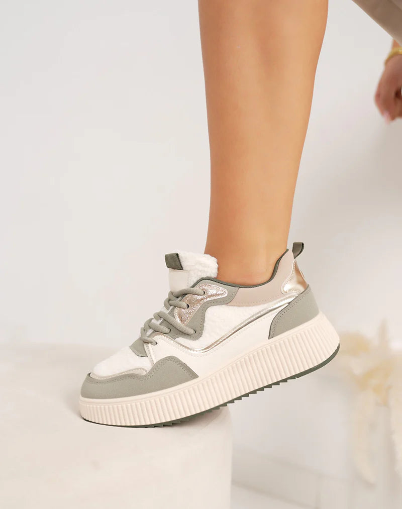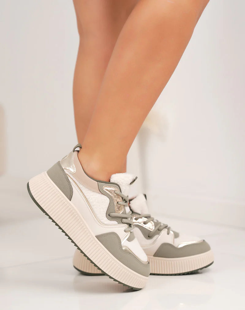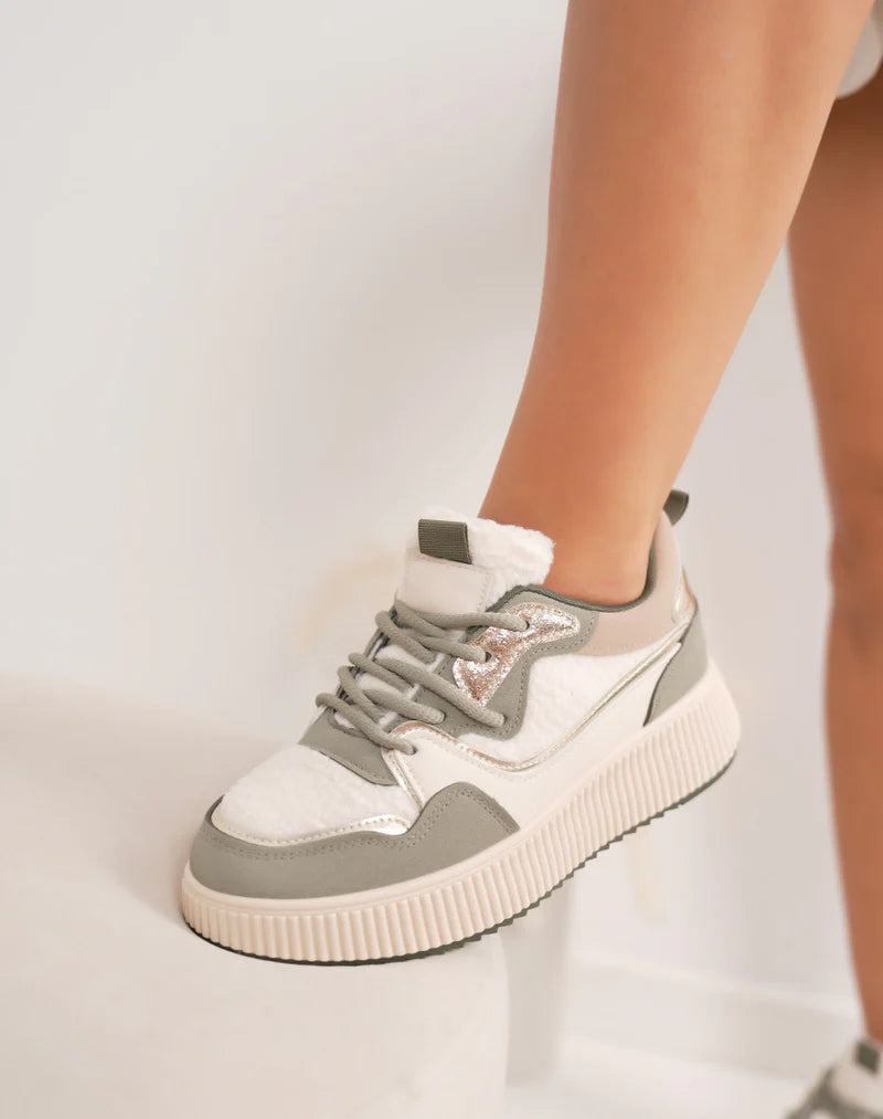 Adoptez un style comfy et affirmé avec ces baskets vert kaki à empiècements effet moumoute. Leur design travaillé mêle suédine, détails beige, touches métallisées et lacets cordes pour une allure pile dans la tendance automne-hiver.